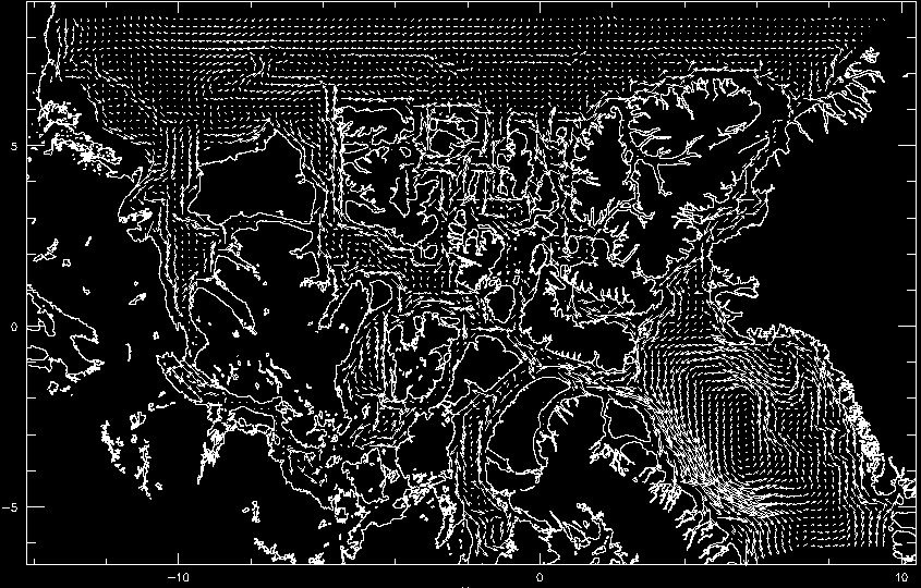 Using orthogonal curvilinear regridding of the sphere, this configuration enables a view of the role of the Arctic in global thermohaline circulation. In the figure, vectors representing the model flow have been “bundled” into flow tubes for easier visualization. A linked page describes differences between this result and a more traditional ideas. |