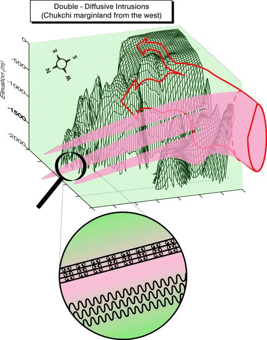 Mixing in an ocean stratified with respect to both heat and salt can include phenomena called “salt fingers” and “layering”. Even circumstances where both heat and salt are stabilizing support “differential” mixing. A figure depicts the circum-Arctic boundary current (seen above in model flows) providing a source for long sloping intrusions into the Arctic interior. The intrusions are alternately bounded by layering and fingering. A link further describes these phenomena which are incorporated into AIM. |