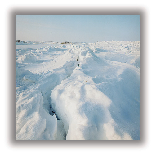 Sea ice is not level. It is broken by leads and crushed into pressure ridges which collide with other ridges. Blowing snow leaves drifts and bare spots.