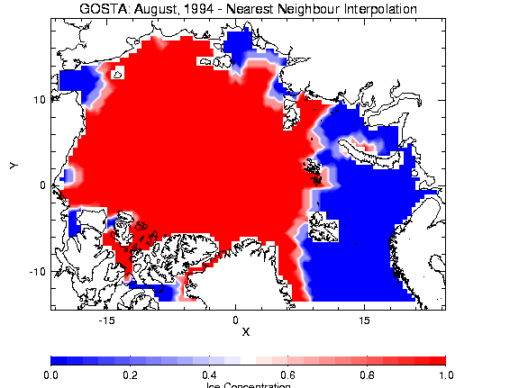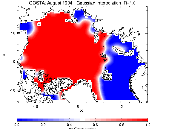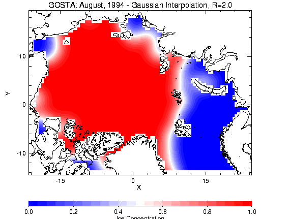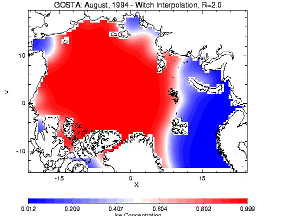 A radius value of 0.5° has been chosen for the NSIDC and GOSTA routines. By increasing the radius value, the interpolated data values will increase, as distant points will have a larger weight. The converse will happen if R were to decrease. Comparing gaussian to witch interpolation, by comparing the average ice conc. value as given in IDL, the results are similar to only one, occasionally two significant figures.