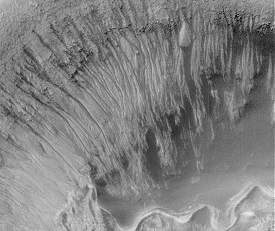 | Mars tells a different story. So far as is known, the only water on Mars surface occurs as ice, with traces of water vapour in Mars' thin, cold atmosphere. But was Mars always so cold and dry? Features that look like drainage channels occur in many regions. Were these carved by Martian rivers flowing into ancient Martian seas on a warmer, moister Mars? If so, what happened? | ![]() |